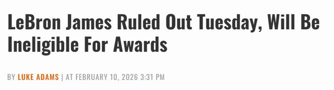 詹姆斯的缺陣是其中最受關(guān)注的一點(diǎn),這將是他本賽季缺席的第18場(chǎng)比賽。這意味著他本賽季將無(wú)法達(dá)到65場(chǎng)的出場(chǎng)門檻,而這是球員有資格競(jìng)爭(zhēng)賽季末各大獎(jiǎng)項(xiàng)的最低要求。