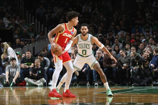凱爾特人上一場(chǎng)主場(chǎng)119-109終結(jié)雷霆12連勝,老鷹過(guò)去3場(chǎng)連贏勇士、灰熊與活塞收獲3連勝,本賽季前兩次交鋒雙方各取一勝。本場(chǎng)凱爾特人缺少武切維奇與布朗,老鷹缺少蘭代爾。首節(jié)開局雙方7-7,老鷹一波9-0攻勢(shì)取得領(lǐng)先,豪瑟中投追分,老鷹連中三分一波9-0攻勢(shì),凱爾特人已經(jīng)9-25落后16分差距。凱爾特人回敬一波17-4攻勢(shì)追分,首節(jié)結(jié)束凱爾特人26-29落后老鷹。首節(jié)老鷹21中8,其中三分11中5,杰倫6中4得到12分;凱爾特人22中11,其中三分9中3,塔圖姆4中2得到5+2+1。