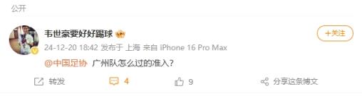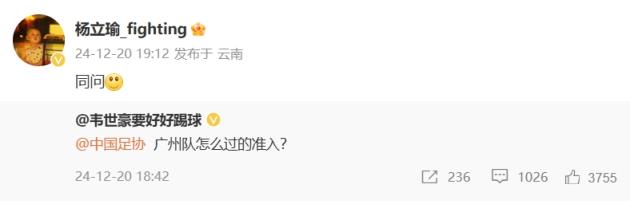 12月20日訊 韋世豪發(fā)聲質疑后,楊立瑜轉發(fā)韋世豪微博質疑足協(xié)準入。
